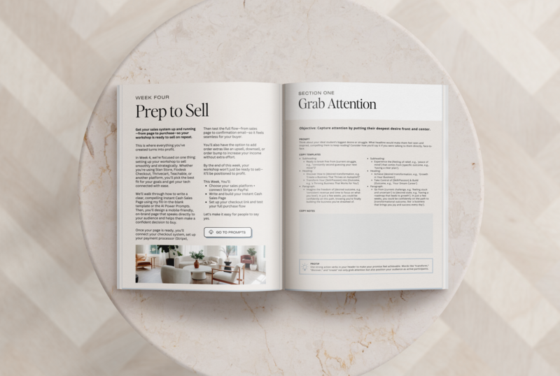 Plug in expert-crafted Power Prompts to name, script, price, and sell your workshop—without sounding robotic, salesy, or stuck in perfectionism.